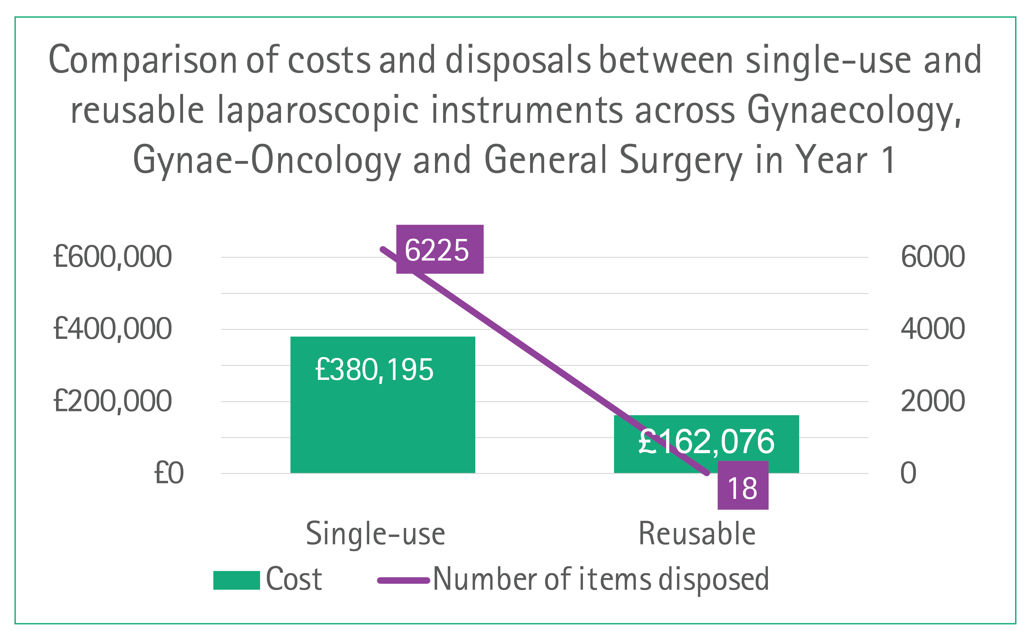 Adopting reusable laparoscopic instruments is a pivotal strategy for advancing environmental sustainability in surgical practice. This approach reduces reliance on single-use plastics, minimises waste generation, and supports healthcare systems in meeting carbon reduction targets. Over a year, the Queen Elizabeth Hospital performs around 1,152 laparoscopic procedures across General Surgery, General Gynaecology and Gynae-Oncology, with each procedure using between three and seven laparoscopic instruments. By switching from single-use to reusable instruments, the hospital has saved 6,225 instruments from disposal in a year (Figure 2), with a combined weight of 723.2 kg. By Phase 4, an additional 3,000 single-use plastic trocars, weighing around 390 kg, were also avoided.